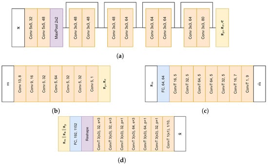 An overview of the full model architecture can be found in Figure 5. In the model, each layer is followed by batch normalization and uses the ELU activation function (unless mentioned otherwise). For training the model, the loss functions in Equation (2) were used. In Equation (1), the first term represents the reconstruction loss, while the remaining terms represent the KL divergence between the encoded prior () and the (learned) prior (). The penalty terms for each KL divergence are represented by . In Equation (2), each additional term represents the loss of the different auxiliary classifiers (), with being the penalty term for each classifier. The dataset was split into a training set containing 34,721 samples and a test set containing 14,881 samples, with both datasets being balanced. For training, we set each parameter to 0.5. Both and were set to 12, while was set to 1. The hyperparameters for and were selected to ensure the model learns a well-organized latent space while still generating high-quality samples. The model was trained using the Adam optimizer [42] with a batch size of 64 and a learning rate of 0.0005 until convergence.