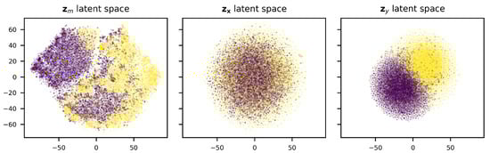 To verify that the model has learned an organized latent space, we have visualized the latent spaces using t-SNE [45] dimensionality reduction. As can be seen in Figure 6, the disentanglement of the DIVA model indeed appears to be successful, as there seems to be a clear separation between classes in and , while this is not present in . Taking a further look at the distribution of the fraction of base pairs in the stem, terminal loop length, and the stem length over the latent space (Figure 7), we see that the latent space is well organized. Therefore, it can be used by our decision tree algorithm to develop a pre-miRNA description.