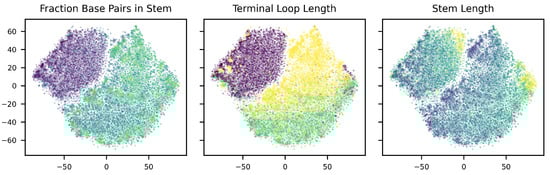 latent space colored according to the fraction base pairs in stem, terminal loop length, and stem length. Lighter colors indicate higher values for each variable.