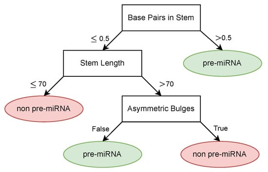 In addition to the high classification performance, the decision tree learned biologically sound classification rules. The first split in the decision tree is made based on the amount of base pairs in the stem, where samples with a high amount of base pairs are considered to be pre-miRNA, which is also supported by literature [6]. Similarly, short RNA sequences are also considered unlikely to be pre-miRNA [6], which can be seen in the second split of the tree. The final feature used by the tree to discriminate pre-miRNA from other RNA is the absence of large asymmetric bulges, which is also a known property of pre-miRNA [46]. In general, given the supplied features, we see that the decision tree is able to generate a biologically valid description of pre-miRNA.