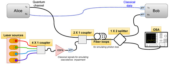 Experimental setting for the QBER/SKR data acquisition. From the bank of lasers, one could select the number (1–4) and power of the classical signals placed in the C-band coexisting with quantum data placed in the O-band. An Erbium-Doped Fiber Amplifier (EDFA) could be connected after the laser bank to further amplify the powers of the lasers. A number of fiber loops of diameter ≈2 cm could be formed along the QKD link to induce the photon losses. An Optical Spectrum Analyzer (OSA) (ANRITSU MS 9710c, ANRITSU, Morgan Hill, CA, USA) was used to monitor the attenuation in the fiber link.