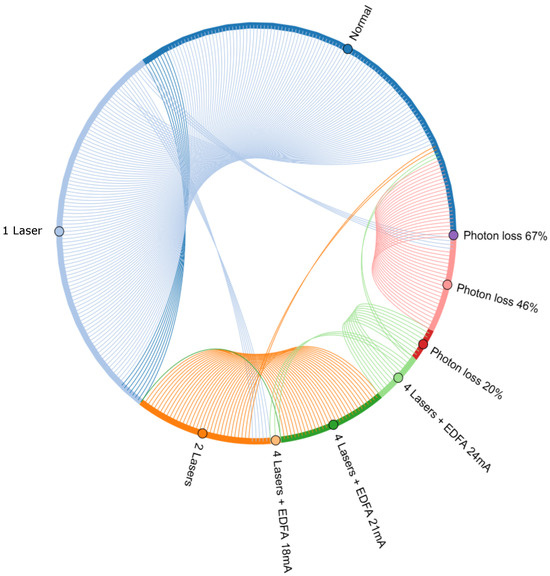 We proceeded with the application of the ML methodology on the acquired data and we first split these as 80–20% for training–test, respectively. The test data were always derived from the tail end of the time series since a plain random split would result in a training set that contained data from time frames ahead of some test data, which could lead to misleading results. After training the XGBoost and NN models, predictions were made on the test set and the results are provided in Table 1. These are complemented by the confusion matrix in Table 2 and the chord diagram of Figure 3, which intends to give a visual representation of the misclassified data. The results in the table show that the Precision, i.e., the number of true positives divided by the total number of positive predictions, was high for all the impairment types. On the other hand, the classes ‘1 Laser’ and ‘2 Lasers’ were predicted less frequently than the others, as one can read from the Recall column. We correlated this outcome with the fact that for these specific classes, the data corresponding to the different levels of powers for the lasers were merged together. This argument is supported by the fact that for the cases where the EDFA was used, the model was able to distinguish between the different levels of power and the prediction outcomes were very good. Finally, the model showed the highest confidence in distinguishing the different levels of photon loss, particularly in the case of 67% photon loss, where the model made statistically no mistakes. The macro average of the F1-score, that is, the weighted average mean of the Precision and Recall, had a value of , and one may conclude that the developed methodology has the capacity to distinguish each class of simulated impairment with a high certainty.