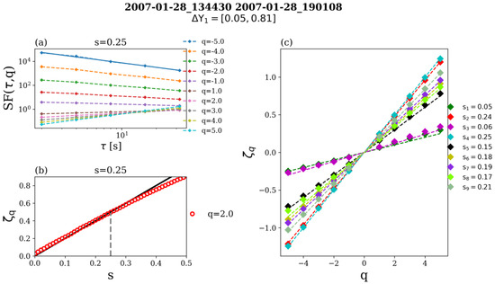 Computing ROMA with an approach available from the ODYN library. This approach is documented in [32] and available from the Python library called “Open source library for turbulence and nonlinear dynamics (ODYN)”. For each order q and each bin ΔY the procedure runs iteratively for all values of s between 0 and 1, with a chosen step, e.g., 0.1, and computes the range-limited structure functions defined by (7) for all analyzed scales. The scaling behavior is extracted from a linear fit in the log-log representation of versus τ, as shown in Figure 1a, following: