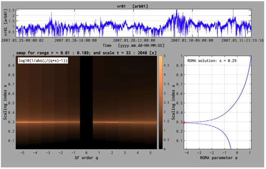 The ROMA approach implemented in INA library [33,35] exemplified for a bin of scaled fluctuations ΔY = [0.01,0.189] and all the moment orders q (from −5 to +5). The upper panel shows the magnetic field energy, , measured by Ulysses between 25 and 31 January 2007. The lower left panel shows the color-coded two-dimensional map of the function log10g(q,s); the “brighter” color indicates the maximum of this function, which identifies the ROMA solution for that corresponding q. The right panel shows the result of the global minimization procedure applied for the fluctuations in the bin ΔY = [0.01,0.189]. The procedure minimizes the function for 100 values of s between 0 and 1 and all the moments q between −5 and +5.