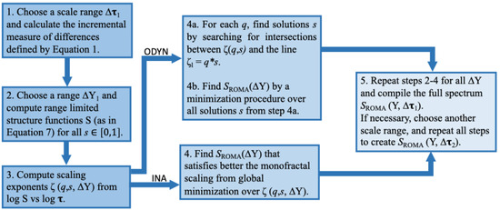 The technical steps to be followed in both strategies adopted to compute a rank-ordered multifractal analysis (ROMA) spectrum are summarized schematically in the diagram shown in Figure 3.