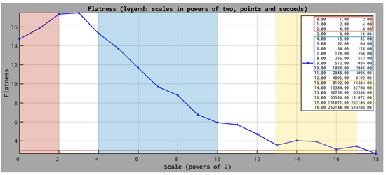 (a) Magnetic field energy, , measured by Venus Express in the solar wind on 28 January 2007, between 13:44:30 UT and 19:01:08 UT. (b) the flatness computed for B2; three ranges of scales are illustrated, between 2 and 32 s (marked with blue), 64 and 256 s (marked with yellow), 256 and 2048 s (marked with red), respectively. The three ranges exhibit different ROMA spectra as discussed in the text.
