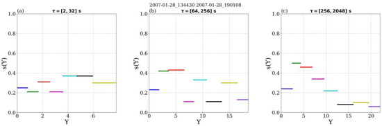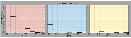 Figure 7 shows the ROMA spectra computed for each of the three ranges discussed above. The ROMA spectrum computed for the smaller range of scales (between τ1 = 2 s and τ2 = 32 s, see Figure 6, corresponding to spatial scales 400 km and 12,800 km) shows values of the s index in a rather limited range, between 0.2 and 0.4, with no clear trend but suggesting anti-persistency. The scaled variable Y takes values between 1 and 8 in this scale range, indicating that the level of fluctuations is quite strong, obviously due to higher values of the magnetic field itself at 0.72 AU (compared with data from Ulysses at 2.5 AU). Due to the limited variation of s, we argue the process at the origin of magnetic energy fluctuation in this range of scales is close to self-similarity possibly described by a mono-fractal. The variation of s around a mean value of 0.4 can be partially due to limited number of samples of the analyzed ensemble.