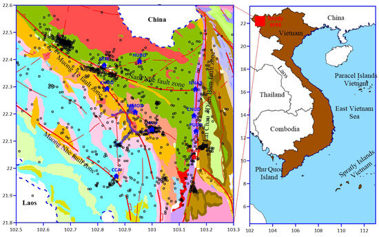 Spatial distribution of earthquake epicenters during the period of September 2014 to June 2021 (dark circles). Lai Chau reservoir is in light blue. The blue and red building symbols indicate the local seismic stations and national seismic stations, respectively. Geology and identified geologically mapped faults (red) with dip and slip direction as given by [18]. (Modified from [22]).