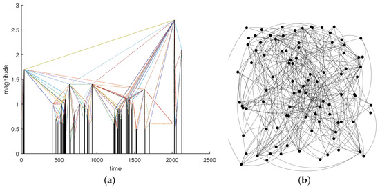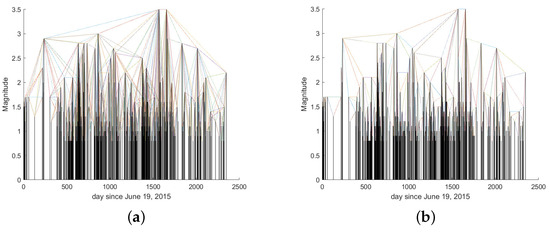 An earthquake sequence can be analyzed using the VG method by considering the magnitudes as the nodes of the graph and “drawing” links between two magnitudes fulfilling the “visibility” rule (Equation (2)). Thus, a seismic sequence can also be converted into a graph using the VG method. Figure 2a shows an example of an earthquake sequence with the links drawn by applying Equation (2), while Figure 2b shows the resulting graph.