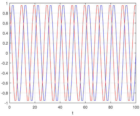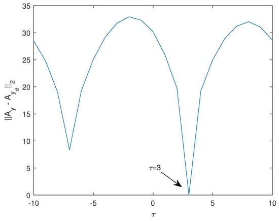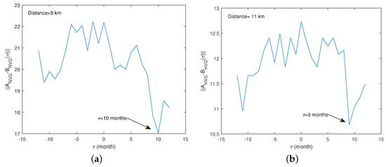 Recently, ref. [32] proposed a method to compare two series and identify the time lag between them using the visibility graph algorithm, which has been shown to be more effective than cross-correlogram techniques. If and are the adjacency matrices of the VGs of time series and , respectively, we can define their “distance”, the quantity , where , called the Frobenius norm of a matrix, is the square root of the sum of the squares of the elements of the matrix, that is, the square root of the trace of the product of the matrix with itself. In mathematical notation, if D denotes the matrix and the th element of D (with ), then
