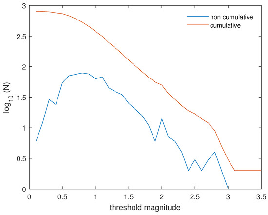 The Gutenberg–Richter (GR) law [23] represents the relationship between the number N of earthquakes with magnitude and the threshold magnitude . The function is utilized to fit the frequency–magnitude distribution of earthquakes. The parameters a and b indicate, respectively, the level of seismicity and the proportion of small events compared to large ones. The b-value is crucial for reliably assessing the seismic hazard of an area [24,25]. In this paper, the estimate of b is performed by using the maximum likelihood method (MLE) [26]: