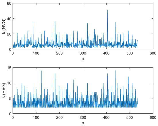 The VG method has been applied in several research fields, like economics [1,2,3], weather forecasting [5,6], medicine [29], etc. One of the most relevant parameters of the VG method is the degree that is the number of links departing from a node; generally, the higher values of the series behave as hubs of the graph, since they “attract” more links than those converging to the lower ones.