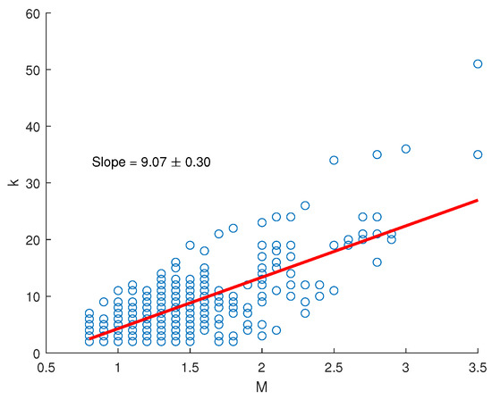 k-M relationship between the degree and the magnitude for the whole seismic dataset. The slope of the regression line is 9.07.