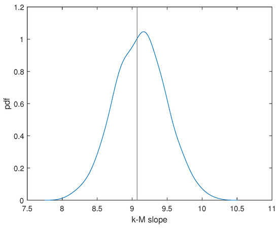 Distribution of the k-M slope for the randomized earthquake sequences. The vertical line indicates the k-M slope of the original sequence.