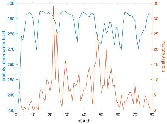 Monthly earthquake counts (red) and mean water level (blue) during the investigation period.