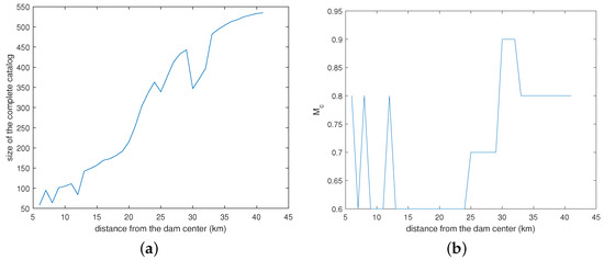 Figure 11 shows the variation with the distance from the center of the completeness magnitude (Figure 11b) and the number of earthquakes with magnitude greater than or equal to (Figure 11a).