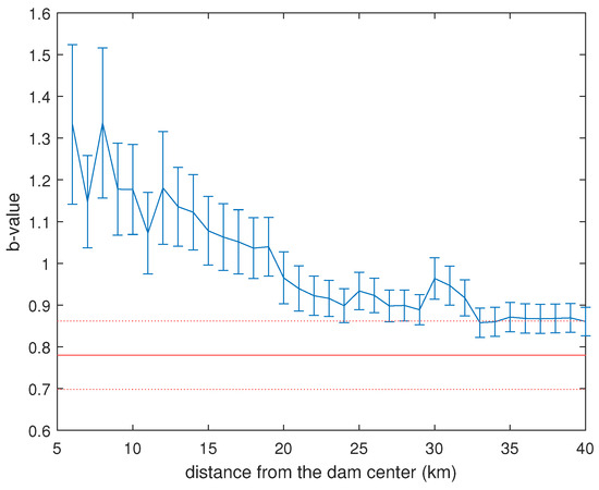 Variation of the b-value with the distance from the center of the dam (blue). The red horizontal line represents the b-value calculated for the tectonic seismicity observed prior to the reservoir impoundment, corresponding to a completeness magnitude of 0.7, as indicated in [34]. The error on b is indicated by the vertical bars, while the red dotted horizontal lines delimit the error band on b calculated in [34].