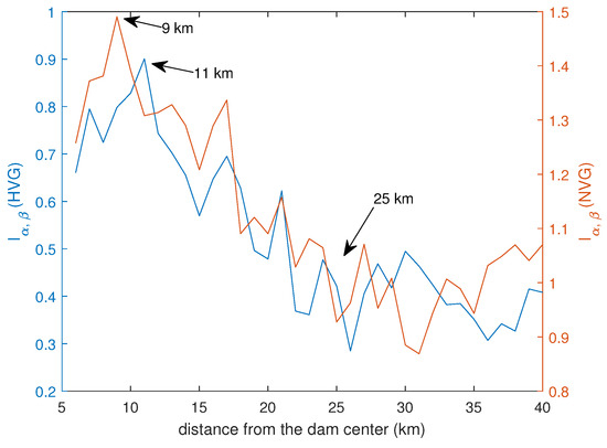 We calculated the IMI between the monthly number of earthquakes and the monthly mean water level (Figure 13). The variation of the IMI with the distance from the center of the dam is quite similar to that of the b-value; for small distances, it increases, reaching a maximum at 9–11 km, then it decreases up to approximately 25 km. For larger distances, it fluctuates around mean values of approximately 0.99 (NVG) and 0.39 (HVG).