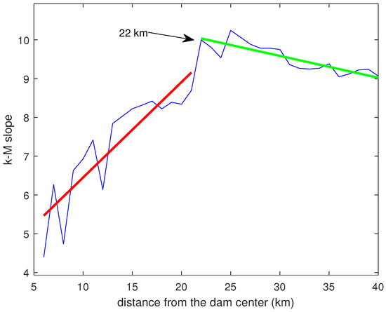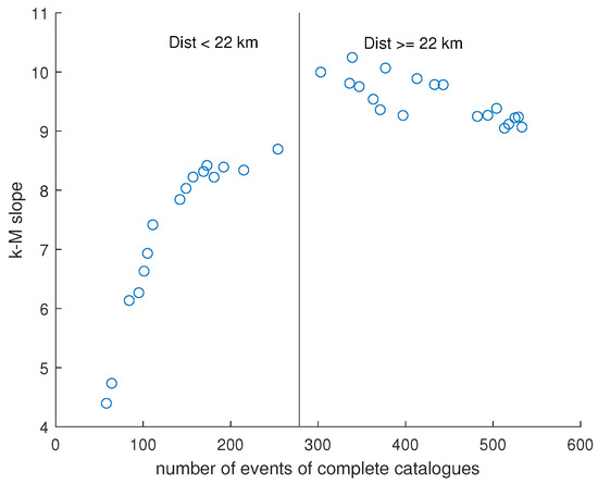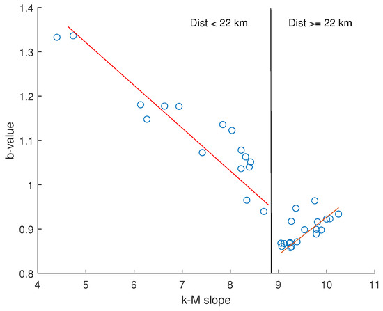 Figure 15 shows the variation of the slope with the distance from the dam center. This topological parameter exhibits an increasing trend followed by an approximately constant or weakly decreasing one. In order to more precisely identify the breakpoint between these two trends, we applied the segmented regression method [36]. The found breakpoint is at 22 km. Figure 16 shows the relationship between the b-value and the slope for the Lai Chau seismic sequence compared with that of seismic datasets analyzed in previous studies [11,12,37]. For distances from the center of the dam greater than or equal to 22 km, the Lai Chau seismic dataset aligns with the general relationship found for the other seismic datasets, while, for smaller distances, the seismic sequences in the Lai Chau area deviate from this general relationship. Focusing only on the Lai Chau dataset, the relationship between the k-M slope and the b-value (Figure 17) is characterized by two distinct behaviors. For distances from the dam center less than 22 km, the relationship is negative, while for distances greater than or equal to 22 km, the relationship is positive. To explain the negative relationship for distances less than 22 km, we analyzed the k-M slope in relation to the number of events for each distance. We found that, up to about 22 km from the center of the dam, the k-M slope increases with the number of events, whereas, for distances greater than 22 km, the k-M slope appears to be independent of the number of events (Figure 18).