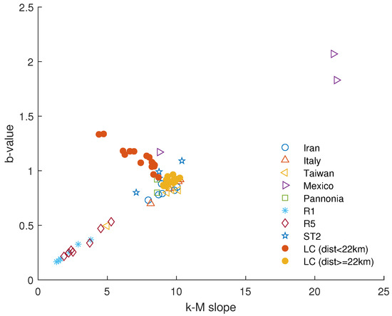 Relationship between the k-M slope and the b-value for the Lai Chau dataset (for distances from the dam center less than, larger than, or equal to 22 km) compared with that of the seismic datasets analyzed in previous studies (Iran [12], Italy and Taiwan [33], Mexico [11], Pannonia [38], R1 and R2 [39], and ST2 [37]).