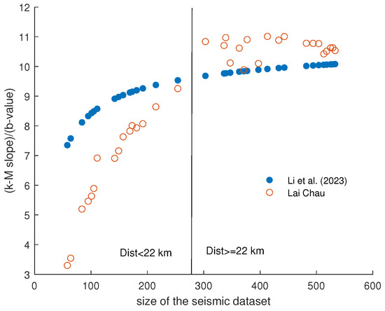 We calculated the ratio between the slope and the b-value for the Lai Chau data and related it to the number of earthquakes, changing the distance from the dam center. The results are shown in Figure 19 and compared with Equation (7). Although the two curves do not perfectly overlap (Equation (7) is derived from Poissonian catalogs), their trends are almost identical. There is a clear increase in the ratio with the size of the catalog, which tends to stabilize as the catalog size grows. For the Lai Chau dataset, the saturation of the ratio starts for distances from the dam center larger than 22 km.