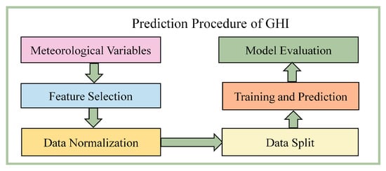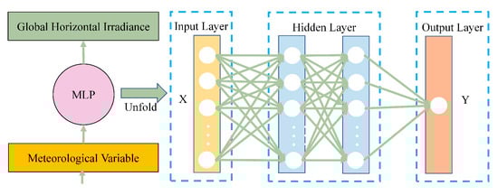 The MLP network is primarily used to establish the complex correlation between GHI and meteorological variables. The main procedures for predicting GHI, as shown in Figure 2, include the input of meteorological variables, feature selection, data pre-processing, training and prediction of the model, and model evaluation.