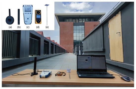 To accurately predict the GHI and estimate the corresponding , we conducted relevant outdoor experiments at Sun Yat-sen University Shenzhen Campus in Guangming District, Shenzhen, China, as shown in Figure 5. Our experimental setup included the 843-R-USB power meter, 919P-003-10 thermopile sensor (namely, lens), the Benetech GM8910 anemometer, a black opaque cylinder, a piece of paper, and our computer, as depicted in Figure 5a–d. The 843-R-USB power meter in Figure 5c will be paired with the lens in Figure 5a to observe the solar background irradiance. The detection capability of the power meter heavily depends on both the measurement intensity and the bandwidth range of the thermopile sensor. The black opaque cylinder in Figure 5b is primarily utilized for receiving the direct sunlight and blocking the sunlight in other directions. The paper in Figure 5e is used to block the direct sunlight. The Benetech GM8910 anemometer in Figure 5d can be used for measuring meteorological variables. The technical specifications of the power meter, 919P-003-10 thermopile sensor and Benetech GM8910 anemometer are listed in Table 5, Table 6 and Table 7, respectively. These instruments are utilized to measure solar background irradiance and meteorological variables, as described in Table 8. Our experiments aim to predict GHI during the daytime (from 8 am to 6 pm) under both cloudy and sunny weather conditions, as there is no irradiance at night.
