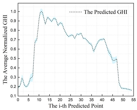 The characteristics of the GHI obtained from the experiments are analyzed in Table 9. The optimal meteorological variables optimized by the two-stage feature optimization algorithm based on the correlation and redundancy between variables are DNI, DHI, T, RH, and LWS. These variables were integrated into the MLP network for GHI prediction. The MLP model was employed for 20 iterations of GHI training and prediction, yielding error bars for the standard deviation of GHI prediction as depicted in Figure 6. The mean model metrics for , , , , , and were 0.0821, 0.1323, 0.0571, 0.2900, 0.9787, and 0.9171, respectively.