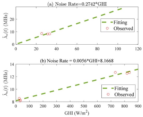 The noise rate is used to evaluate the level of noise caused by global horizontal irradiance (GHI). The following two stages are proposed to accurately estimate . First, the GHI is predicted by the MLP network; see Section 2.3 for further details. can be estimated by linearly converting GHI into , as outlined in Section 3.1.