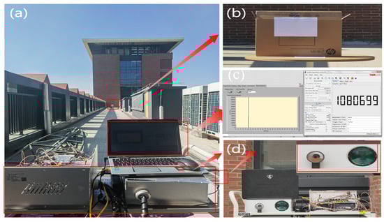 The relevant ranging experiments for single-photon-counting lidar were conducted at the same location. The experimental scenes and equipment are shown in Figure 8, while the corresponding parameters are taken from Table 4. The experimental setup primarily consists of a computer in Figure 8a,c, a lidar system in Figure 8a, an empty box with a target (specifically A4 paper) in Figure 8b, and an attenuation lens in Figure 8d. The computer is primarily used for storing experimental data and visualizing the distribution of the received signal through a histogram. The attenuation lens is placed at the transmitting port of the lidar system to reduce the intensity of the transmitted signal. The lidar system utilizes pulsed laser for precise targeting and primarily consists of a PIN detector, a Si SPAD detector, and a time-correlated single-photon-counting (TCSPC) module. The PIN detector (DET025 A/M) is equipped with a voltage amplifier that emits laser pulses synchronously, thereby generating a start signal for the TCSPC module (TDCGP22). Then, the Si SPAD (SPCM50 A/M) detects and amplifies the echo signal captured by the receiving module, thus triggering an avalanche response. The TCSPC module accurately records the precise arrival time of each photon and generates a histogram based on these recorded events.