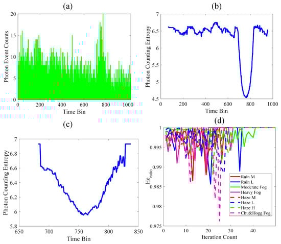 The simulation analysis of our proposed method. (a) Photon counting histogram for heavy fog. (b) The photon counting entropy obtained without optimization of the offset parameter. (c) The photon counting entropy obtained with optimization. (d) The threshold determination of .