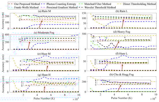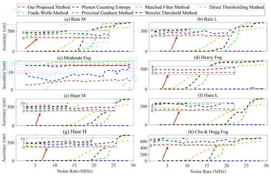 The graph illustrates the gradual increase in ranging error as the noise rate increases. The results depicted in Figure 10a,b,d–h demonstrate that for below 15 , the matched filter, direct thresholding, Frank–Wolfe, proximal gradient, and wavelet threshold methods exhibit a small error, within 10 . However, the ranging error of these methods increases significantly when exceeds 15 , reaching over 600 . The moderate fog in Figure 10c exhibits satisfactory performance across various methods, with a ranging error of less than 20 , which can be attributed to the high SNR related to a target distance of 100 . The photon counting entropy and our proposed method effectively quantify the uncertainty between the signal and noise, enabling precise determination of the signal’s position while ensuring that the ranging error remains below 15 cm, as demonstrated in Figure 10. The proposed method performs better, with an error of approximately 5 .