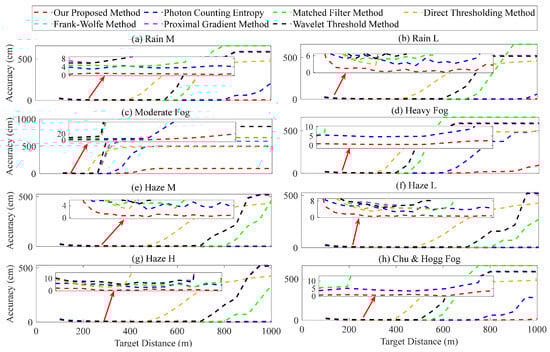 The evaluation of the ranging performance of various methods was conducted simultaneously, taking into account the target distance H. The simulation parameters were as follows: K was set at ; the target distances ranged from 100 to 1000 , with an interval of 50 ; the SNR ranged from 0.01 to 225.08; the selection process for other parameters was based on an analysis of the accumulated number of laser pulses. The average ranging error obtained from 10 simulated measurements is shown in Figure 12. Figure 12a–h illustrates that as the H increases, there is a gradual increase in the ranging error obtained by various methods. In particular, the photon counting entropy, matched filter, direct thresholding, Frank–Wolfe, proximal gradient, and wavelet threshold methods exhibit a significant increase in ranging error, reaching over 200 . The proposed method demonstrates superior ranging performance, with the error within 20 in Figure 12c and within 10 for the others.