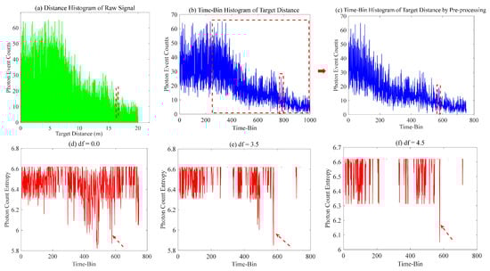 The initial test of our proposed method involved conducting the ranging experiment at a target distance of 16 . The distance histogram of PEs corresponding to the observed data was obtained and is displayed in Figure 13a. The time-bin histogram can be generated within the specified range of 0–20 by selecting a distance resolution of 0.02 , as depicted in Figure 13b. The general signal is typically located in the descending region of the histogram. The primary cause of the initial rise zone is mainly attributed to the interference caused by solar background noise. The drop region (5–20 ) can be preserved by truncating the observed data during pre-processing, as shown in Figure 13c. Various distinct values ( = 0.0, 3.5, and 4.5) of offset parameter can result in different outcomes for the photon counting entropy, as illustrated in Figure 13d–f. The determination of the target signal’s location becomes challenging in Figure 13d due to the presence of multiple peaks caused by not optimizing the offset parameter ( = 0.0), which is a comparison method based on the photon counting entropy. The peaks caused by solar background noise can be effectively eliminated by setting = 4.5, and the corresponding target position can be clearly distinguished.