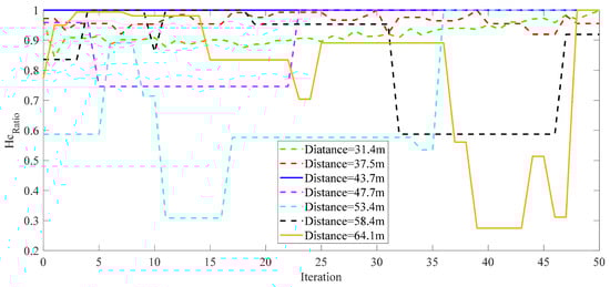 The optimal offset parameter is determined using our proposed method based on the desired threshold condition for . By selecting seven groups of distances, with K = , and conducting 50 iterations to calculate the corresponding , the threshold is determined, as depicted in Figure 14. The figure illustrates that the majority of values are concentrated above 0.6. Therefore, we choose 0.6 as the desired threshold.