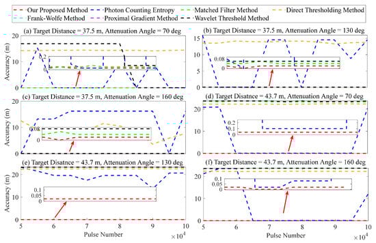 Figure 15 demonstrates that the matched filter, Frank–Wolfe, proximal gradient, and wavelet threshold methods exhibit high sensitivity to the intensity of the target signal for lidar. The ranging error of these methods can exceed 20 when the target is located at a greater distance (43.7 ) and the signal strength is weak, as depicted in Figure 15d–f. The ranging error remains small, less than 20 cm, when the target distance is 37.5 and the signal strength is high, as depicted in Figure 15a–c. The direct thresholding method in Figure 15 may exhibit sensitivity to the signal strength of two target distances, potentially resulting in a range error of up to 20 . The method for measuring photon counting entropy shows significant fluctuations. In favorable scenarios, the ranging error is less than 10 cm. However, in unfavorable scenarios, it can exceed 40 m, indicating a lack of stability. Compared to other methods, our proposed method demonstrates superior accuracy in error within a range of 5 in Figure 15.