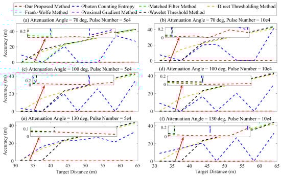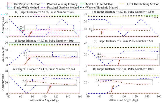 Furthermore, in terms of attenuation angle, the superiority of our proposed method is validated through comparison with other methods. We selected two target distances (47.7 and 53.4 ), three accumulated numbers (, , and ), and five attenuation angles (40, 70, 100, 130, and 160 ) for analysis. The corresponding SNR varied between 1.03 to 2.10. The results are presented in Figure 16. Figure 16a–f demonstrates that the matched filter, direct thresholding, Frank–Wolfe, proximal gradient, and wavelet threshold methods yield significant range error when analyzing two target distances (47.7 and 53.4 ) due to the high sensitivity of the strength of target signal. The error can exceed 30 , which poses challenges in accurately determining the target’s location. The method of photon counting entropy demonstrates significant fluctuations, as evidenced by Figure 16a–f. For example, in Figure 16a, the ranging error is approximately 10 when the attenuation angle is 70 and 100 , whereas it increases to about 23 at an attenuation angle of 130 . Our proposed method demonstrates excellent performance of signal recognition, with the error ranging from 10 to 30 .