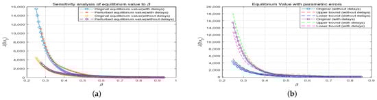 Table 1 shows that the belief degree represents the confidence level in reducing economic losses caused by carbon emissions. For instance, if carbon-emitting enterprises require an initial start-up fund of 10 million, they should prepare million dollars considering delays. From Table 1, we observe that the equilibrium value when , resulting in government losses of million. When , the equilibrium value is , and the government losses are million. At , the equilibrium value is , with corresponding government losses of million. When , the equilibrium value drops to , and the losses are million. At , the equilibrium value further decreases to , with losses of million. For , the equilibrium value is , and the losses are million. Finally, at , the equilibrium value is , resulting in the smallest government losses of million. This analysis reveals that both the government and carbon-emitting enterprises incur significant costs to achieve their objectives. It is also evident that due to the influence of jumps and delays, economic losses from terrorism are lower when and higher when . Among the given belief degrees, results in the least economic loss, and generally, higher values correlate with lower economic losses . Additionally, the presence of jumps and delays increases the equilibrium value compared to scenarios without these factors when . This means that economic losses rise due to jumps and delays, aligning with the real-world dynamics and the objective laws of counter-terrorism economic issues. From Figure 2, Figure 3, Figure 4, Figure 5, Figure 6, Figure 7 and Figure 8, we can intuitively observe the dynamic variation curves of the equilibrium strategy and the equilibrium value at different confidence levels . For governments, incorrect belief degrees may result in uneven resource allocation. For enterprises, mistakes in belief degrees can harm brand image and even lead to bankruptcy. Thus, improving the decision-making belief degree is crucial. Both governments and carbon-emitting enterprises must enhance the scientific and rational aspects of their decision-making processes, thoroughly considering various factors, conducting comprehensive research, and avoiding hasty decisions based on subjective assumptions. Establishing sound decision-making mechanisms and responsibility systems is also essential to ensure transparency, accountability, and support for sustainable economic and social development. In future development, governments and carbon-emitting enterprises should prioritize enhancing decision-making belief degrees by developing policies or strategies that both minimize emissions and maintain competitiveness and economic viability. Incorporating detailed economic analysis and being open to policy adjustments based on those insights will ensure that decisions are not only environmentally sound but also economically sustainable.