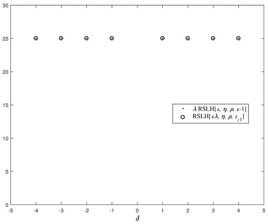 Furthermore, according to Construction 1, the value of δ can be −4, −3, −2, −1, 1, 2, 3 or 4. Through computer experiments, along with changes in δ, we analyze the corresponding and , as shown in Figure 2, where , , and . On the basis of Figure 2 and Theorem 2, for all the possible δ, B is always an optimal LHZ-FHS set.