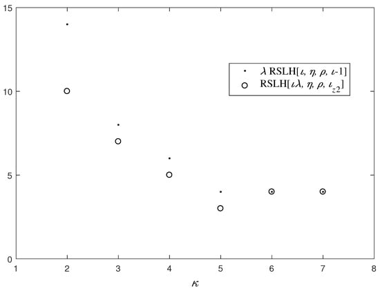Furthermore, based on Construction 2, we have . Through computer experiments, as the value of κ varies from 2 to 7, we analyze the corresponding and , as shown in Figure 4, where , , and . According to Figure 4 and Theorem 3, C is a near-optimal LHZ-FHS set if , while it is an optimal LHZ-FHS set if .