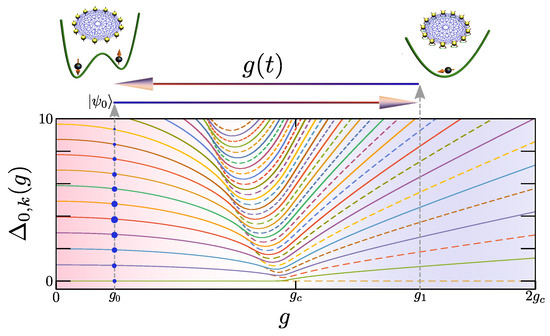 where denotes the energy of the kth eigenstate for g. In addition, we assume that the Hamiltonian commutes with a discrete parity operator , , so that the eigenstates can be labeled in terms of the eigenvalues of , or , owing to a symmetry, i.e., the eigenstates can be written as with , and similarly for its energy , so that