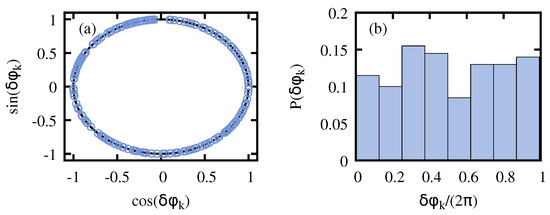 The effectiveness of the AQIS of the symmetry-breaking information is intimately related to the distribution of the phases , i.e., the difference of the accumulated phase among eigenstates of opposite parity, as discussed in Section 2. Thus, the proper quantum information scrambling requires to uniformly sample . In Figure 3, we show the resulting distribution of these phases for a LMG model comprising spins for the first 200 eigenstates, and with and . Note that it approximately corresponds to a uniform distribution in the range . Similar results can be found for other choices of , N, , and , provided that ensures that the system enters in the normal phase. Otherwise, if the system remains in the symmetry-breaking phase during the whole cycle, then , since during the protocol, and information scrambling will not occur.