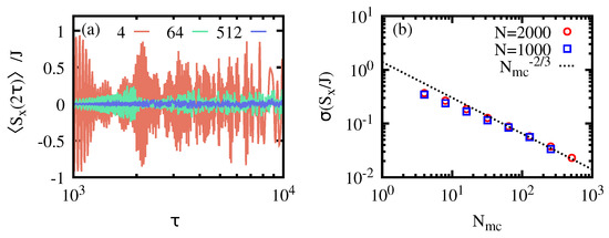 As stated in Section 2, the effectiveness of AQIS depends on the number of populated eigenstates in the initial state, i.e., on the support of on the eigenstates of . The initial state given in Equation (12) allows us to systematically analyze the validity of Equation (10) as increases. We first note that, if , then the final expectation value of will simply undergo an oscillatory dependent on . This can be seen in Figure 4a for an initial state with , which hardly scrambles the symmetry-breaking information, as one can recover the initial value at a suitable time . Yet, as grows, this is no longer the case, due to the uniform distribution of the phases , which forces the final expectation value to average to zero, i.e., . The effectiveness of AQIS can therefore be quantified in terms of the fluctuations of around its average value, i.e.,