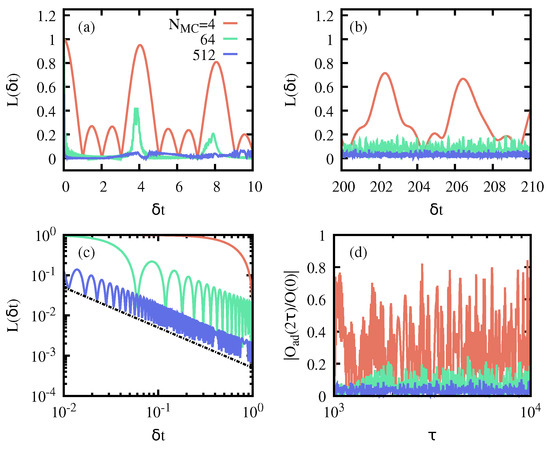 with . Note that under the adiabatic approximation, the previous quantity does not depend on , i.e., . Again, as for the effectiveness of AQIS (Equation (10)), for initial states with a large support and uniformly distributed phases , one expects , even for . The results are plotted in Figure 5a–c, which precisely reveal a vanishingly small echo for small time mismatches . Although not explicitly shown, we note that similar results can be obtained if, instead of a time mismatch , a deviation in another quantity is considered, such as in . In particular, we observe a decay for short and . As expected, in states with little support (few populated eigenstates), displays large revivals, and never decays to 0, a clear indication of the failure of quantum information scrambling.