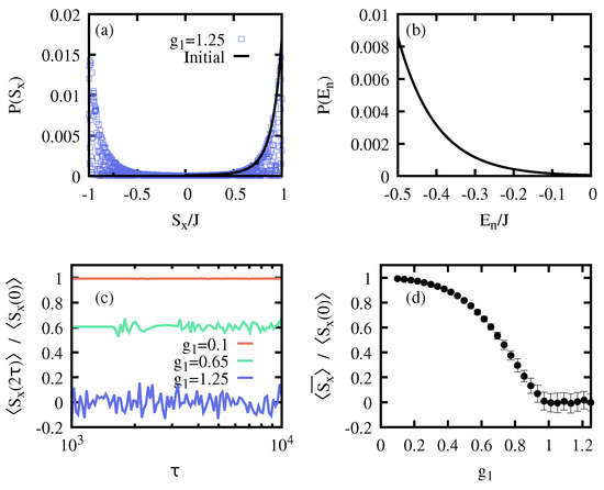 where the coefficients are chosen according to the sign of , so that is positive, and the probability distribution only shows non-zero values in the positive branch. See Figure 2a,b for the initial probability distribution of this microcanonical-like state where and spins with . The dynamical protocol follows Equation (5) with to ensure that the system is completely driven into the normal phase (cf. Figure 1). The final probability distributions are also plotted in Figure 2a,b for the and energy, respectively. Considering slow ramps (), we first note that the energy probability distribution remains unaltered, i.e., the coefficients approximately hold constant. To the contrary, significantly differs from the initial distribution as a consequence of AQIS. The final state populates both branches of the observable , and thus its expectation value after the completion of the cycle vanishes, . This can be better visualized in Figure 2c, where we show the evolution of as a function of . Since the dynamical evolution is to a very good approximation adiabatic, other observables not related to the symmetry-breaking information remain unchanged, such as or the energy (cf. Figure 2d). In the following, and to ease the numerical simulations, we assume that the evolution is adiabatic, and thus make use of the approximation given in Equation (6) to compute the final state after the cycle.