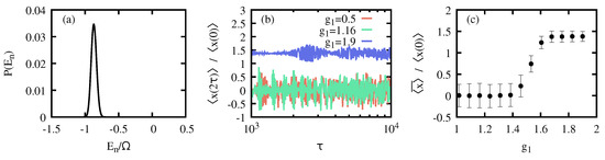 as our initial symmetry-breaking state. There, represents a coherent state with amplitude , and is the vacuum state, while the spin is its ground state, . This corresponds to a state in the other well of the effective double-well potential in the symmetry-breaking phase [62,63]. The symmetry-breaking information is then attributed to the expectation value of the position operator, .