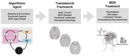Conceptual Roadmap—From agent theory to treatment. The algorithmic agent framework provides conceptual links between first-person experience and information processing and guides the search for the causes of MDD (see Section 2). The translational framework represents the various theoretical functional modules from the perspective of circuits and dynamics with special emphasis on the clinical biotypes pertaining to MDD. Based on brain circuits and individualized biotypes, different MDD interventions are proposed for treatment.