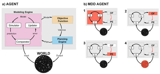 The Objective Function is a key agent component in the context of KT and, crucially so, in the study of MDD. It maps a model—whether that selected by the agent in the present moment or posited in the process of planning—into a scalar quantity, which in KT is directly identified with valence. This metric evaluates the agent’s state in relation to its goals. For natural agents, valence assesses the probability of achieving tele/homeostasis, thereby providing the basis for the selection of actions of future value. In biological organisms, natural selection selects agents that “stay” as patterns, a process that shapes features of the agent, such as the Objective Function and Modeling Engine. In our theory, the Objective Function value is the quantity optimized by the Planning Engine (discussed below). The Objective Function, like other agent modules, may be realized as a distributed system [,], with subsystems possibly tasked with assessing positive or negative contributors to tele/homeostasis. The computation of present or future contributions to valence may be very complex as it entails running the world model and compressing the result into a single number—explicitly or implicitly []. In the case of the human brain, many distributed systems are likely involved in its calculation, from the basal ganglia to the neocortex, as we discuss below. Recent investigations in depression using causal mapping methods are converging on dichotomous circuits reflective of symptomatic dimensions of positive and negative affect, which can be analogously mapped onto the Objective Function’s architecture dedicated to valence computation [,,,]. Furthermore, the computation of valence involves varying temporal scales, some of which are probably short (to enable fast reaction times) while others may require longer ones (e.g., rumination through the simulation of potential futures). The Objective Function thus may integrate evaluations across these disparate temporal domains.