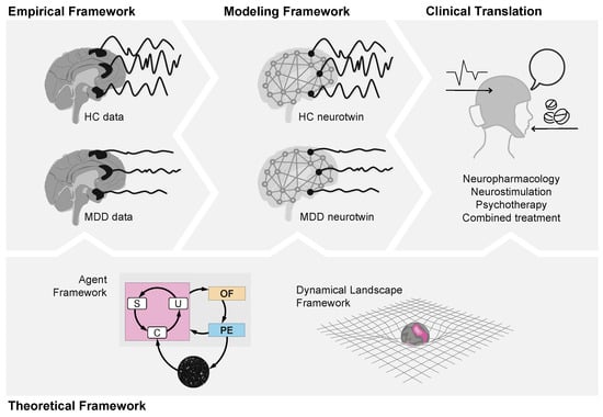 Along these lines, we recently introduced a framework integrating concepts from dynamical systems, computational modeling, and complexity to explore the relationship between neural dynamics, brain connectivity, and plasticity—all of them associated with the realization of the agent model in the biological brain []. This interdisciplinary framework can be used to analyze the mechanisms behind pathological disorders such as MDD and the potential therapeutic effects of psychedelics.