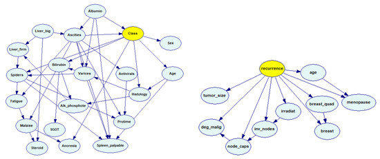 Example BN models learned from data: Hepatitis (left) and Breast Cancer (right). The yellow nodes (Class and recurrence) represent class variables.